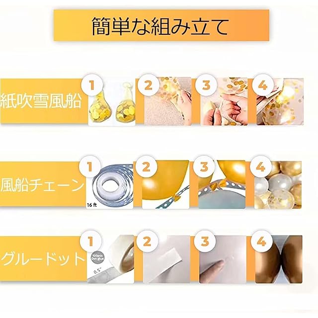 組み立てが簡単:バルーン アーチ ストリップ、接着剤塗布、ストラップ ツールを使用すると、バルーンをすばやく結び付けることができ、簡単にバルーン アーチになり、手を解放できます。 バルーンディスペンスを使用すると、バルーン間の隙間を小さなバルーンで簡単に埋めることができます。 膨らませた後、紙吹雪バルーンをカーペット、髪、またはテリータオルでこすり、紙吹雪がバルーンにくっつくようにします。