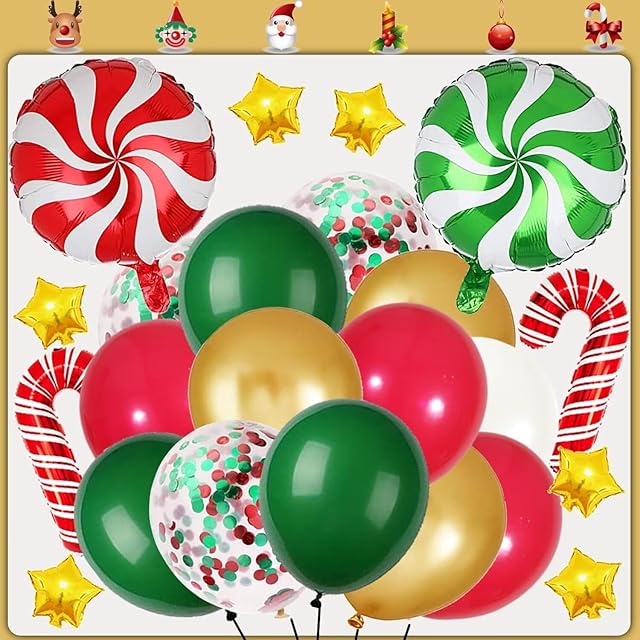 「クリスマスデコレーションバルーン:25cmの赤い風船、ダークグリーンのバルーン15個、白い風船各15個、メタルゴールドのバルーン3個、紙吹雪のバルーン8個、15cmの赤い風船、ダークグリーンの風船5個、白い風船5個、五芒星の風船5個、43cmの3個」赤いキャンディーケーンバルーン、18インチの赤いキャンディーホイルバルーン1個、緑のキャンディーホイルバルーン1個、バルーンアーチストリップ1個、接着剤付きリボンのセット。