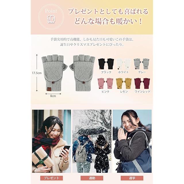防寒手袋 レディース手袋冷え切った外気に触れた瞬間から、保温性の高いニットが保温効果を発揮! はめた瞬間で温かさを実感できる驚きの速熱性能。朝の通勤や通学時、急な外出時にも快適にお過ごしいただけます。レディース防寒手袋指先までしっかり温まる設計で、しもやけ知らずの快適な冬をサポートします。
