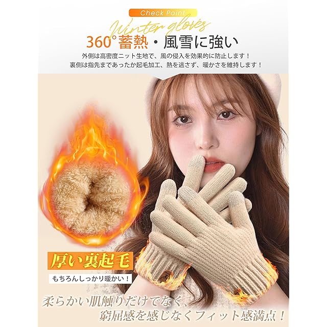 ❄【指先まで裏起毛・360°蓄熱!】二重構造になっており、指先まで厚くてふわふわ裏起毛の防寒手袋です!外側は高密度ニット生地で、風の侵入を効果的に防止し、風を通しにくい!裏側はあったか起毛加工、着けた瞬間からポカポカ暖かさを感じます!詰まった裏起毛は防風性をさらに向上し、体の熱を外に逃しません。そのため、手袋レディースの防寒保温性が倍増し、寒いアウトドアでの長時間着用は問題なし!