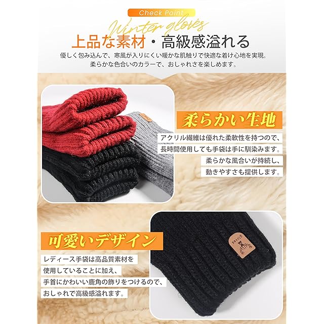❄【幅広いシーンで使える】レディース手袋は高品質素材を使用していることに加え、手首にかわいい鹿角の飾りをつけるので、高級感溢れます。デザインもおしゃれだし、カラー展開も豊富だし、あらゆるコーディネートに合わせやすい。ニット手袋は良い防寒保温性・防風性・伸縮性を持ち、スマホ対応でき、雪にも負けない!クリスマス、母の日、誕生日に、家族、友達、彼女へのプレゼントにおすすめです。