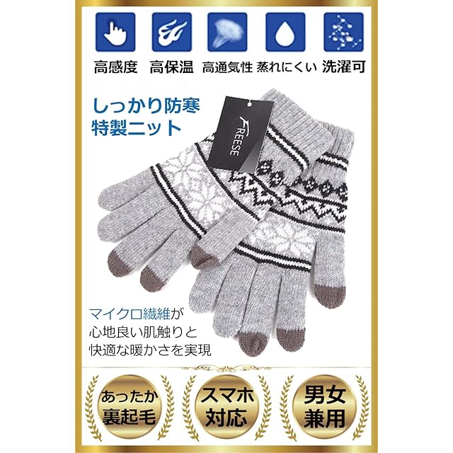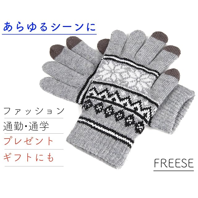 商品名:[FREESE] 手袋 グローブ スマホ対応 【あったか裏起毛】 防寒グローブ ニット 毛糸 タッチパネル 秋冬 ノルディック柄 おしゃれ ファッション スポーツ 通勤 運動 メンズ(グレイ/ホワイト)