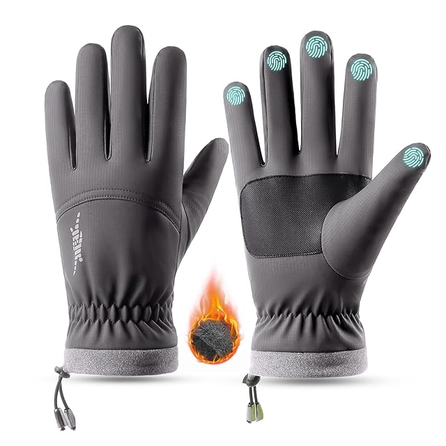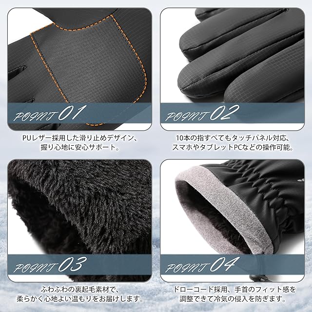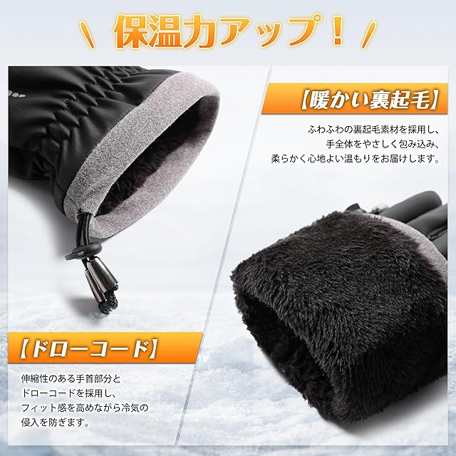 【ふわふわ裏起毛・寒風にも暖かい】このグローブはふわふわの裏起毛素材を使用し、柔らかく心地よい肌触りが特徴です。手首部分は伸縮性があり、ドローコードも採用することで、冷気の侵入を防ぎフィット感を高めます。そのため、高い保温性を発揮し、寒風から手をしっかり守ってくれます。