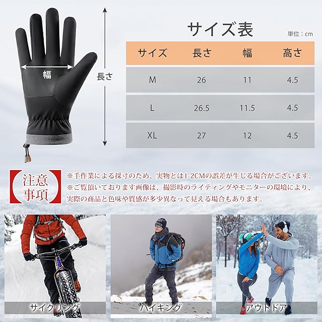 【滑り止め加工】手のひら部分にPUレザーを採用し、滑り止め性と耐摩耗性に優れています。手袋と物との摩擦力が高まり、しっかりと握ることができます。【タッチパネル対応】この手袋には導電性繊維の特殊素材を採用し、ほとんどのタッチスクリーン電子製品をサポートします。急な電話やメールも手袋を外さずに操作可能です。文字入力などの細かい動作もスムーズに行えます。ランニング、登山、自転車などのシーンで、スマホで地図を確認できるのでとても便利です。