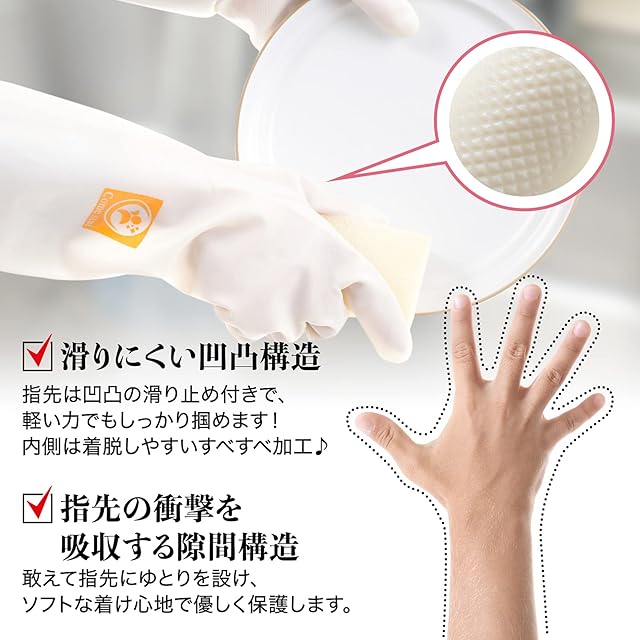 ✅【滑りにくい仕様】 滑りにくいように第1関節付近まで凹凸の滑り止め構造になっており、軽い力でしっかり掴めるからお皿洗いなど食器の取り扱いも安心です。 さらに指先強化構造で破れにくい♪水が入りにくい腕付近までのロングタイプですが、口が広く内側はすべすべで、着脱が楽に行えます。