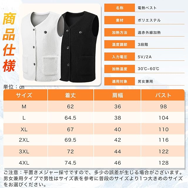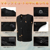 【様々なシーンで活躍】モバイルバッテリーを収納する専用のポケットがあるので、より使いやすくなっています。普通の熱線ウェアより実用性が高く、1着持っているだけで使用シーンが広がります。ユニセックスかつシンプルなデザインで、M~3XLの5つのサイズを用意しております。年齢問わず(20代、30代、40代、50代、60代)、男女ともにお使いいただけるベストです。幅広く活躍できます。敬老の日、記念日、誕生日、クリスマス、新年など心温まるプレゼントとしても喜んでもらえます。通学通勤、出張、旅行、バイク、ゴルフ、釣り、キャンプ、サイクリング、スポーツ観戦、屋外作業、屋内着用など色んな場面で活躍します。