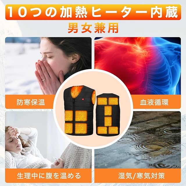 ご注意:バッテリーは別売です。【背中、腰、腹部に前後10枚ヒーター付き、快速発熱】ヒートベストの前後には10つの加熱エリアがあり、加熱ヒーターは日本製グラフェンヒーターを採用して、熱効率が以前従来品より増えました。ベストはV字型襟のデザインで、コートを合わせて着ることができ、保温しながらお好きな服を自由に着ることができます。発熱ベストのヒーターが背中、腰、腹部に配置され、私たちの体の中に最も冷えやすい各部位に暖かさを逃さず。冬にアウトドアでの仕事、キャンプ、釣り、スキー、サイクリング、通勤、通学などに適しています。冬の寒さを恐れず、冬の魅力を思い存分に楽しむことができます。
