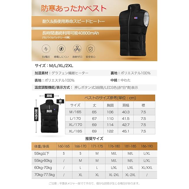 【4サイズ展開 男女兼用】M、L、XL、2XL。人によって、サイズ感の差異があるので、画像のサイズ表をご参考ください。【パッケージ内容】電熱ベスト(USBコード付き)、モバイルバッテリー(PSE取得済)、取扱説明書(書付き)。【一年安心】万が一、初期不良やその他不具合が生じた場合は、商品ページの販売店舗名をクリックして、「質問する」ボタンより店舗までご連絡いただければ迅速に対応いたします。