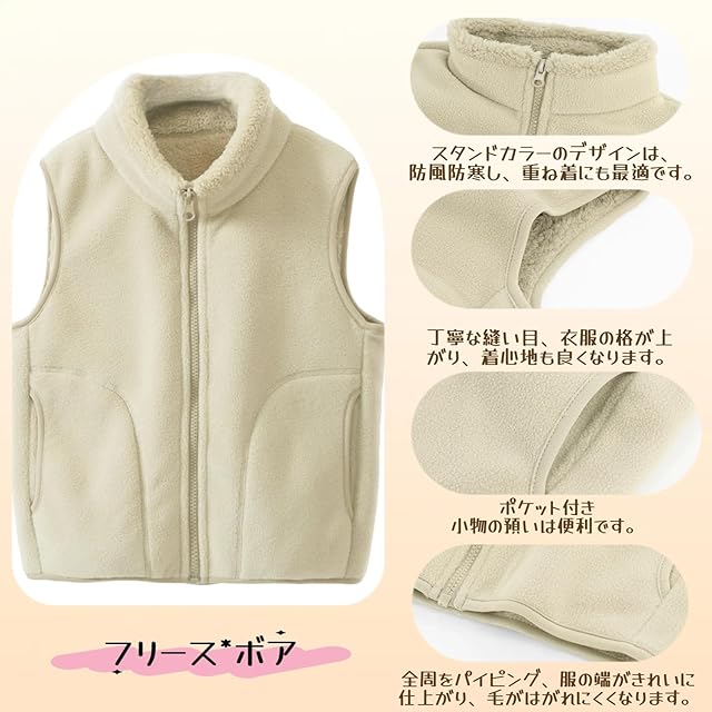 柔らかな着心地: 素材には柔らかさを追求したボアを使用し、肌触りが抜群です。着用するお子様にとっても快適で、自由な動きを妨げることはありません。日常のアクティブな動きにも対応する、ストレスフリーな着心地を提供します。ポケット付きでファッショナブルし便利です。ベスト始末に綺麗なパイピング、スムーズなファスナーをを配して、上品なアウトドアスタイルを格上げします。