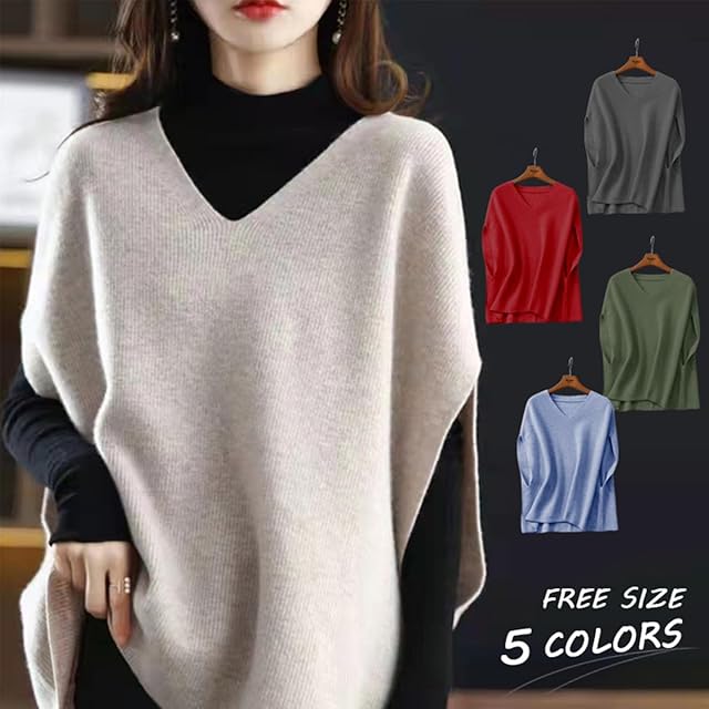 【Vネック×ポンチョシルエットで美バランス】深めVが顔まわりをすっきり見せ、肩落ちデザインが二の腕~腰をふんわりカバー。
