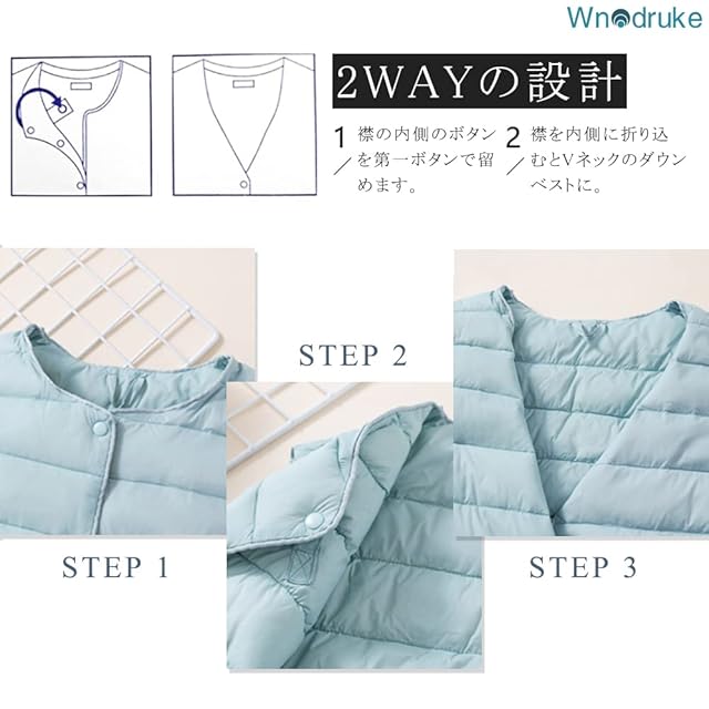 商品名:Wnodruke ダウンベスト レディース インナー ウルトラライト ダウン ベスト Vネック・丸首の2WAY仕様 軽量 防寒 暖かい 収納袋付き WN001 (M, ブラック)
