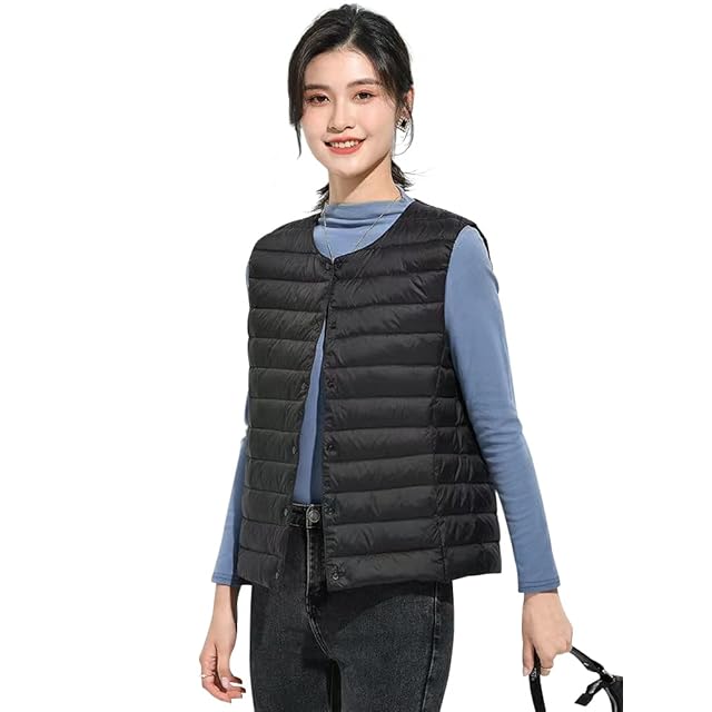 Wnodruke ダウンベスト レディース インナー ウルトラライト ダウン ベスト Vネック・丸首の2WAY仕様 軽量 防寒 暖かい 収納袋付き WN001 (M, ブラック)