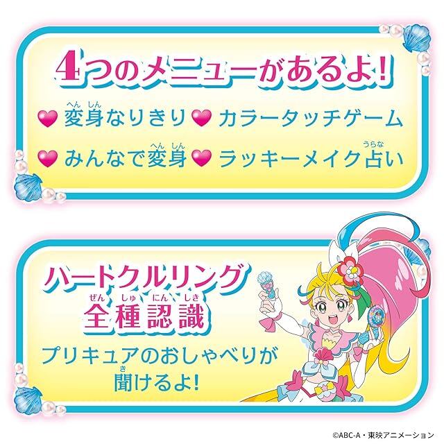 変身なりきりの他、「カラータッチゲーム」、「ラッキーメイク占い」が楽しめるメニューも搭載!ハートクルリング(別売り)全種認識。※別売りのハートクルリングをセットすると、プリキュアのオリジナルセリフが楽しめます。