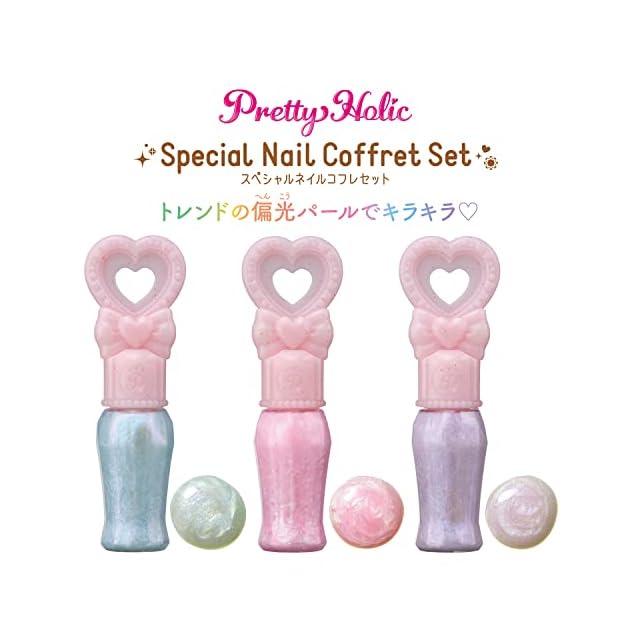 コフレセットは、収納ボックスとこの商品だけのオリジナルカラーのマニキュアが3本と、ネイルシール、ネイルピカピカ♡シートが入ったセットです。