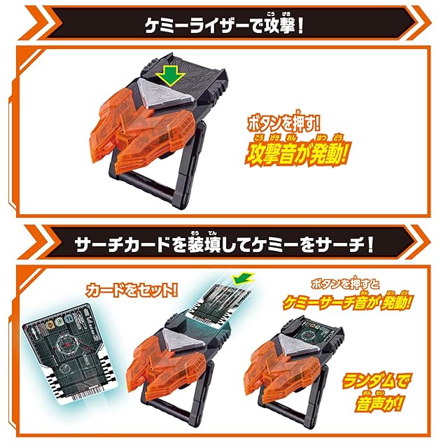 付属の「サーチカード」装填時には「ランダムで音声が鳴る」というケミーサーチ遊びが、別売りの「ブランクカード」装填時にはケミー捕獲遊びが楽しめます。