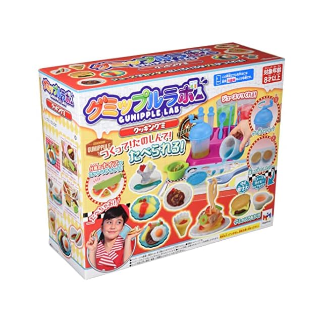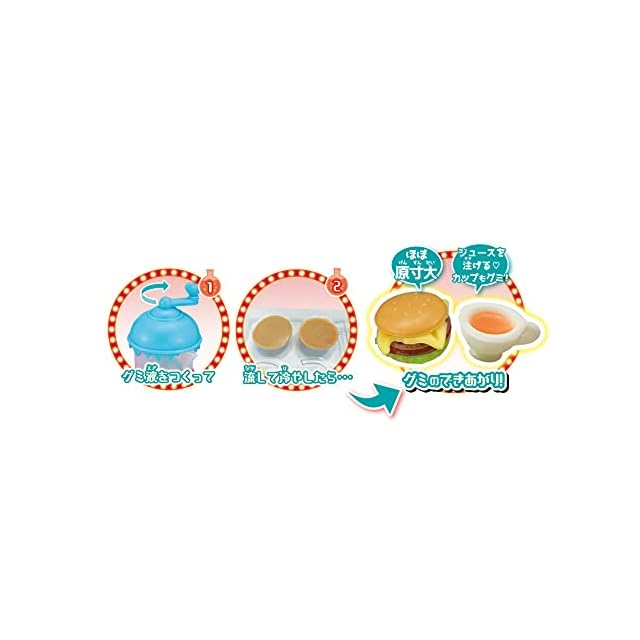 つくって、たのしんで、たべられる! グミでお料理遊びができちゃう! 作り方はカンタン! 1・ジュースとゼラチンでグミ液を作って 2・型に流して冷蔵庫で冷やしたら完成! 作ったグミは美味しく食べられる! ※食材や付属品以外の調理器具は別途ご用意ください。 ※冷蔵庫を使用します。