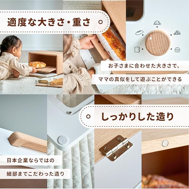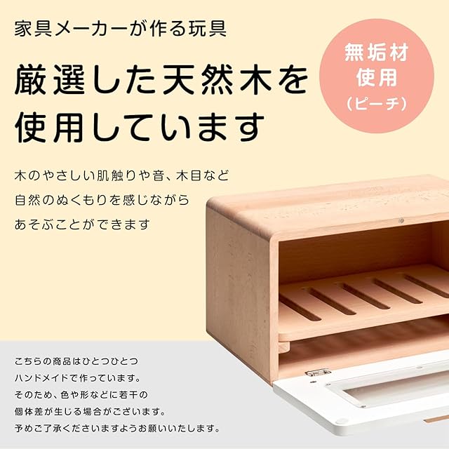 天然木のあたたかみ……プラスチック製や木目調のシートを張ったものとはひと味違う、天然木のあたたかみあふれる木製のトースタートイ。木のやさしい肌触りや、音、木目など自然を五感で感じながら遊ぶことができます。