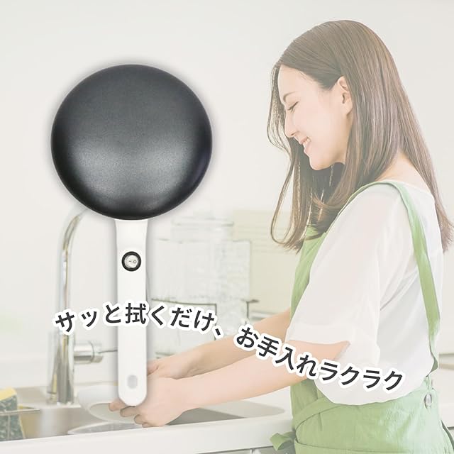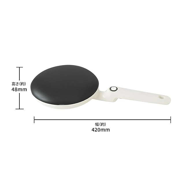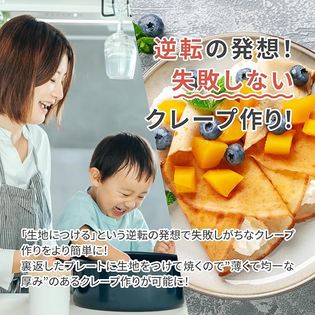 ■自宅で簡単!手作りクレープメーカー♪<br>誰でも薄くてキレイなクレープが簡単に作れるクレープメーカー!<br>「約3秒」浸すだけで均等に生地がプレートに付くので、薄くて本格的な生地が簡単に焼けます♪<br><br>■逆転の発想!失敗しないクレープ作り!<br>「生地につける」という逆転の発想で失敗しがちなクレープ作りをより簡単に!<br>裏返したプレートに生地をつけて焼くので”薄くて均一な厚み”のあるクレープ作りが可能に!<br><br>■できあがりまで【約3秒】!!<br>専用トレーに作った生地を入れ、予熱したプレートを約3秒浸すだけ!<br>薄くて本格的なクレープ生地でさまざまなアレンジレシピを楽しめます♪<br><br>■だれでも簡単!3ステップ!<br>➀ひたす :本体のプレート部分にバターなどを塗り、用意した生地にひたす。<br>②待つ :本体を丸ごとひっくり返して、好みの焼き加減になるまで待つ。<br>➂完成! :好みの焼き加減になったらヘラなどでクレープ生地をはがして、完成!<br><br>■嬉しいポイント盛りだくさん!<br>・お手入れラクラク:本体のお手入れは水をよく絞ったふきんなどでサッと拭くだけでOK!<br>・軽量&コンパクト:プレート直径は約20cm、重さは約750gなのでお子様も簡単にご使用いただけます。<br>・専用トレー付き:付属品としてクレープ生地を入れる大容量400mlの専用トレー付き!<br><br>■アレンジでレシピもいろいろ♪<br>・デザートに:たっぷりの生クリームやチョコソース、さらに好きなフルーツを乗せて定番クレープも!<br>・お食事に:お肉やお魚、新鮮な野菜などを入れていつもと一味違うご飯系クレープも!<br>・その他いろいろ:クレープ生地をそば粉に変えればでフランスの郷土料理「ガレット」や、生地をたくさん作ってクリームと重ねれば「ミルクレープ」まで!<br><br><br>本体サイズ<br>約幅420×高さ480×奥行200mm<br><br>本体重量<br>約750g<br><br>専用トレー<br>約幅225×高さ360×奥行225mm<br><br>専用トレー重量<br>約100g<br><br>専用トレーの容量:約400mL<br><br>素材・成分<br>本体・ハンドル:フェノール樹脂 / プレート:アルミ / 専用トレー:PP<br><br>定格電圧/周波数<br>AC100V 50/60Hz<br><br>定格消費電力<br>650W<br><br>表面温度<br>約200℃<br><br>コード長さ<br>約130cm<br><br>温度調節<br>サーモスタット(175℃)<br><br>安全装置<br>温度ヒューズ(240℃)<br><br>付属品<br>専用トレー、取扱説明書<br><br><br>【注意事項】<br>※分解・修理・改造しないでください。<br>※本来の用途以外に使用しないでください。<br>※正しくお使い頂くために、取扱説明書を必ずお読みください。<br>※使用中、本製品の調子が悪かったり、異常を感じたときは、直ちに使用を中止してください。<br>※乳幼児の手の届くところで使わないでください。<br>※お手入れは必ず本体が冷めた状態で行って下さい。<br>