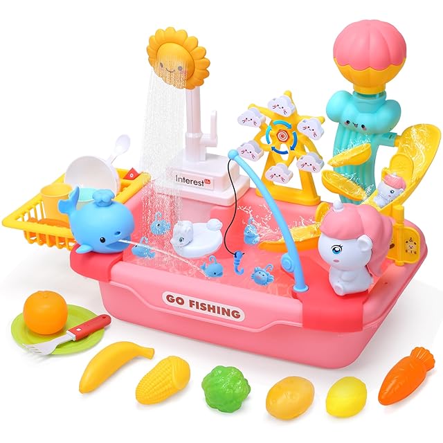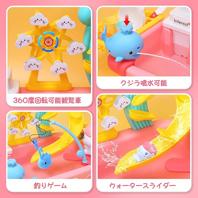✨【1台で遊園地気分!夢中になる6大遊び機能】✨水遊び×釣りゲーム×観覧車×スライダー×クジラ噴水×浮遊気球が楽しめます。6Lの大容量シンクでたっぷり遊びながら、お子様の創造力を育むことができる知育玩具です。