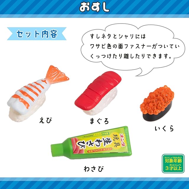 「おもちゃのおすし」セット内容:握りずし(マグロ、エビ)、軍艦巻き(いくら)、生わさび