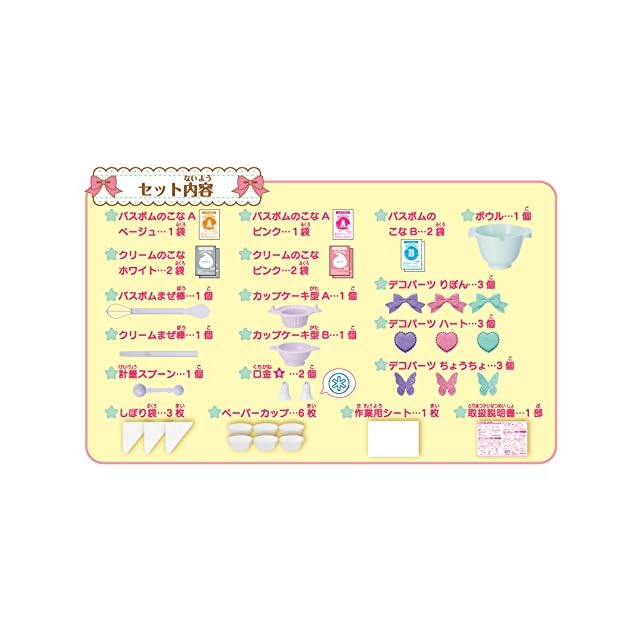 [セット内容]バスボムのこなA×2、バスボムのこなB×2、クリームのこな×4、カップケーキ型×1、ボウル×1、計量スプーン×1、まぜ棒×2、しぼり袋×3、口金×2、デコパーツ×9、ペーパーカップ×6、作業用シート×1、取扱説明書