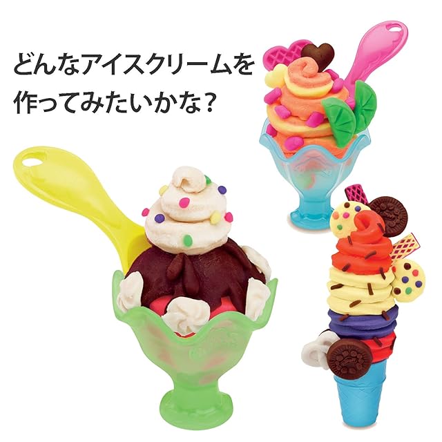 セット内容:プレイセット本体、アイスクリームコーン×6、スプーン×4、アイスクリープカップ×5、ねんど×8、レシピカード×2、取扱説明書