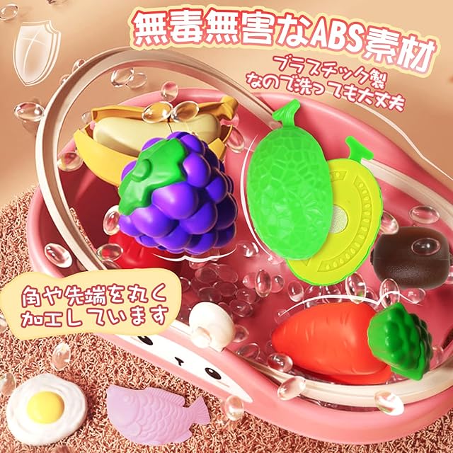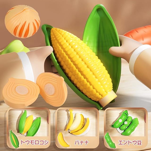 【知育に良い】子どもはごっこ遊びを通じて、野菜や果物などを知り、色を見分けるようになります。また、それらを切ったり、組み合わせたり、お皿に並べたりすることで、手と目の協調、認識能力、創造力を向上させるだけでなく、集中力も高めます。料理を作り、お皿に盛り付けて他の人に食べさせることで、コミュニケーション能力や社会性も身につけます。
