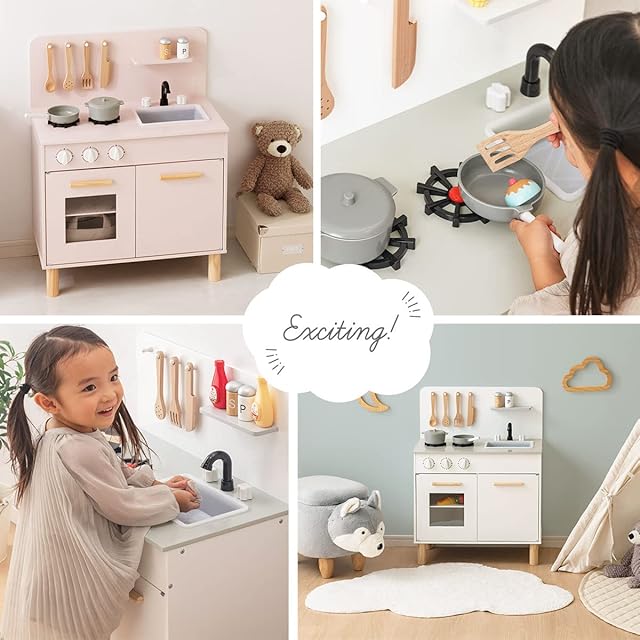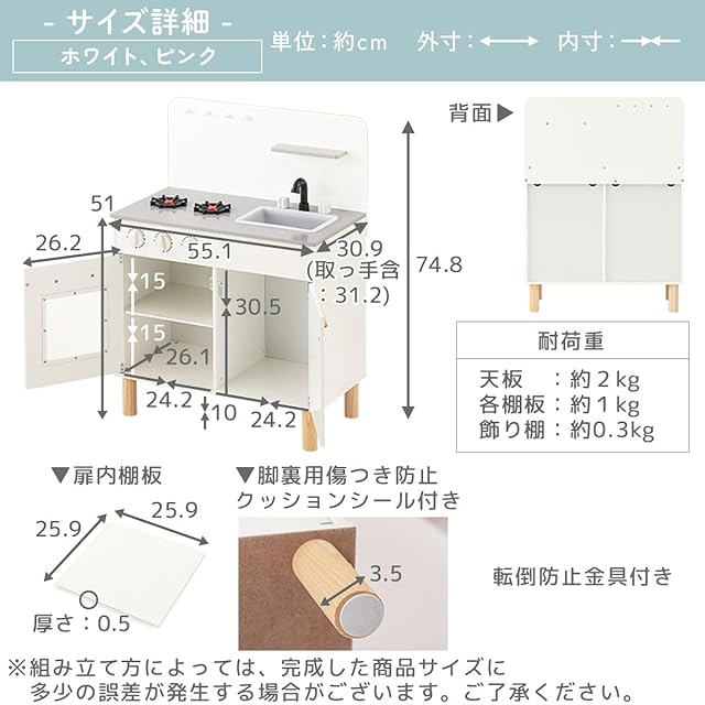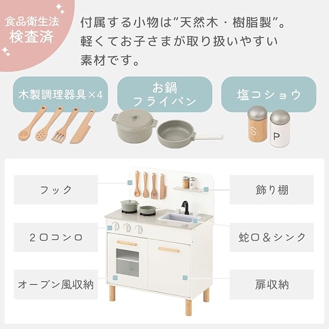 【カラー共通】 材質 キッチン本体:MDF(アクリル樹脂塗装) 側板上部、扉取っ手、脚部:天然木パイン材(無塗装) 【ホワイト】【ピンク】 材質 小窓:PET(ポリエチレンテレフタレート) 木製調理器具:天然木ケヤキ材(無塗装) その他:ABS樹脂、メラミン樹脂、天然木