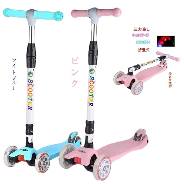 軽量で子供でも持ち運び楽々! ■安定設計:前輪が2輪, 後輪が2輪合弁1輪の3輪構造で安定感を増加します、横倒れしにくい仕様になりました、ファイバーグラス加工されたデッキ部分、滑り止め機能が良い、デッキ面が広くて、より安全に安心して使用できます ■高さ調節で身長に合わせて使える! 商品の説明 ■タイプ: キッズ スクーター サイズ:58cmx23cmx90cm ■重量:約2.6kg ■対象年齢:3歳以上 ■耐荷重:50kg ■ブレーキ: 後輪ブレーキ ■ ウィール: 三輪、PU素材。■ウィール:前輪12cm、後輪8cm ■.ポイント:後輪ブレーキ(安全を支えるのは後輪の役目) ■ハンドルの高さ調整が可能。高さ67cmから85cmまで3段階調整可能:約67cm、約80cm、約85cm(3歳-12歳の子供に向け) ■.ステップ部分の素材がファイバーグラスです。デッキ面が滑り止め加工を施したことで、安心で快適な滑りをサポートします。 ■ 回るとキラキラ光るホイールを使用します。薄暗くなった夕方でも目立つから、視界に入りやすく安全です。 使用上の注意事項○ ※仕様は改善の為に予告なく変更する場合があります。 ※ディスプレイ画面等の環境上、写真と実際の商品の色とは多少違う場合がございます。 ※海外輸入商品により、汚れ/ダメージ等がついている場合がございます。 ○以上を了承の上ご購入ください○