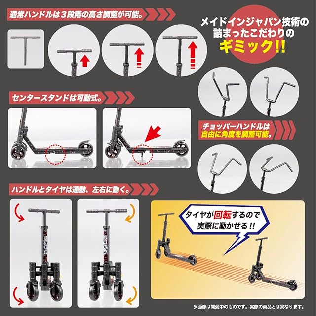 通常ハンドル/チョッパーハンドル、二輪/三輪と様々な組み合わせでキックボードを作成可能。こだわりのギミックで通常ハンドルの高さ調節や、チョッパーハンドルの角度調整、センタースタンドの可動などを実現。ハンドルとタイヤは連動して可動し、タイヤそのものも回転するので実走行が可能!