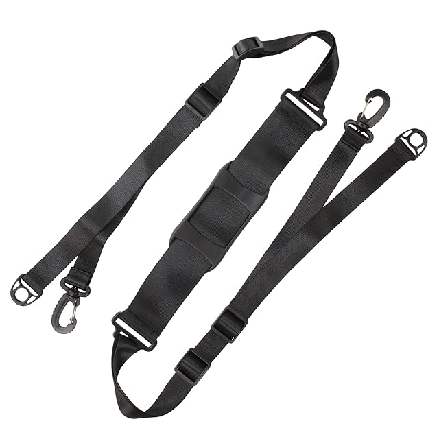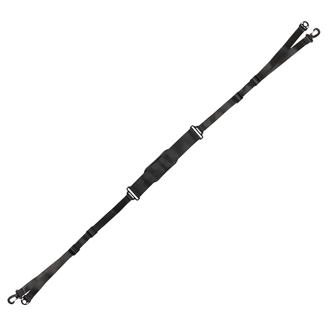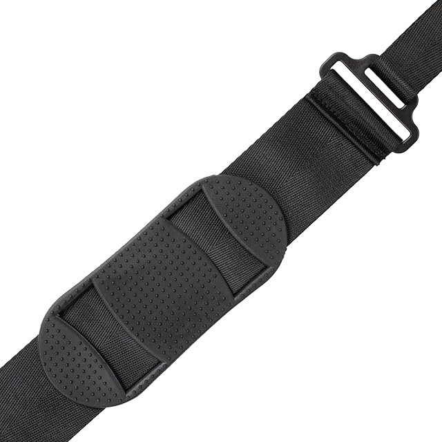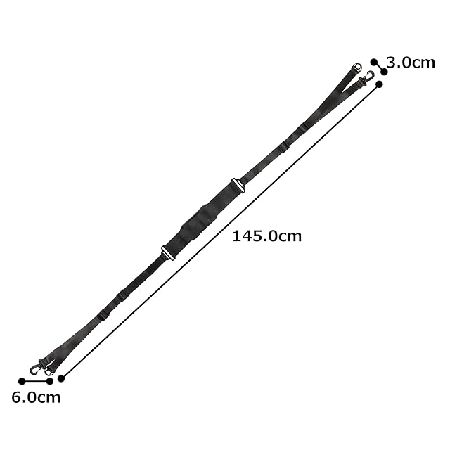 長さ110〜160cmに調整可能。幅25mm、肩パット部分50mm。両端に回転式スナップフック付き