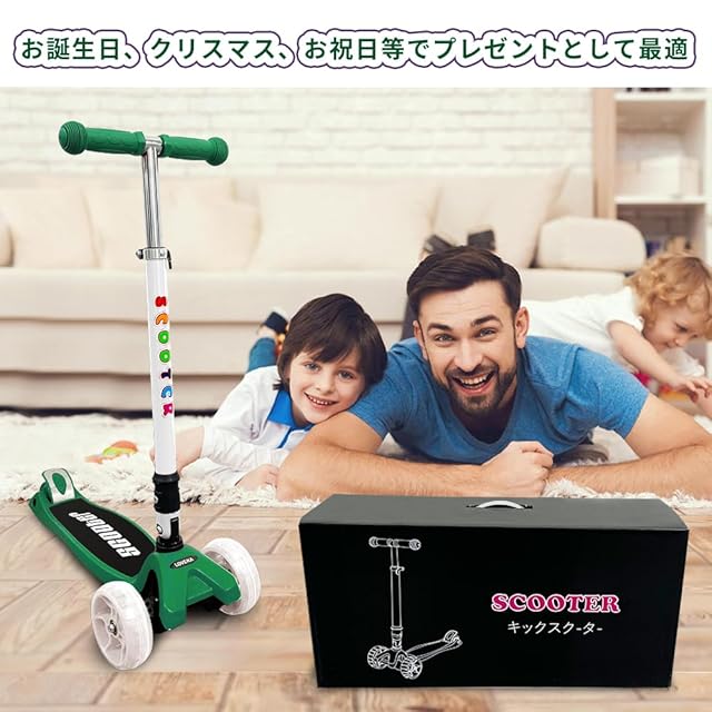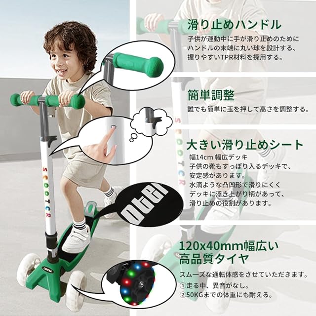 商品名:キックスクーター 子供用 光るLEDダイヤ キックボード 4段階高さ調節 キッズスクーター 3輪タイプ 折り畳み式 軽量 持ち運びに便利 静音 ギフトに最適 誕生日 クリスマスプレゼント (グリーン)