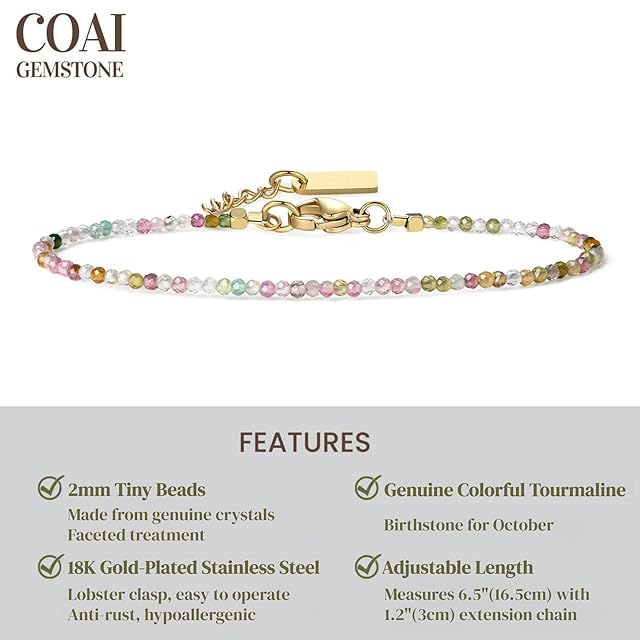 COAIのレディースパワーストーンブレスレットは、2mmの小さな天然石ビーズを使用した繊細で上品なデザインが特徴です。<br>このビーズブレスレットは、選べる3種類のパワーストーンを取り揃え、それぞれが個性的な魅力を放ちます。<br><br>トルマリンは、さまざまな色合いが美しく調和し、華やかな印象を与える石です。<br>アメジストは、その深い紫色が魅力で、気品あるスタイルにぴったりの石として知られています。<br>ムーンストーンは、柔らかな光が虹のように輝き、優雅で神秘的な雰囲気を持ちます。<br><br>どちらの天然石ビーズも複雑なカットが施されており、光を美しく反射し、きらめきを放ちます。この繊細な輝きが、ブレスレット全体に上品さを加え、女性らしい手元を引き立てます。<br><br>レディースブレスレットの長さは15.5cmに3cmのアジャスターチェーンが付いているため、手首のサイズに合わせて調整可能です。<br>単品で着けても、他のブレスレットと重ね着けしても、おしゃれなスタイルを楽しむことができます。シンプルでありながらも、日常のコーディネートに華やかさをプラスするアクセサリーです。<br><br>また、このパワーストーンブレスレットは美しいジュエリーボックスに収められており、保管や持ち運びにも便利です。<br>女性向けのかわいらしいデザインで、カジュアルな場面から少しフォーマルな装いまで、幅広いシーンで活躍します。