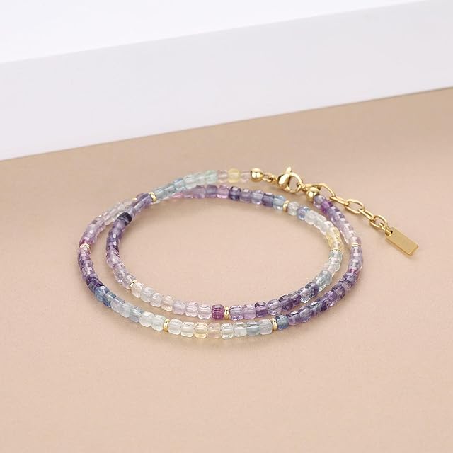 3mmのキュービックパワーストーンビーズと、3×1.2mmのゴールドメッキステンレスビーズを組み合わせた、エレガントでスタイリッシュなレディースダブルパワーストーンブレスレットです。<br>2層のデザインが手元に動きと華やかさを加え、シンプルながらも存在感を放ちます。細身のデザインは、他のブレスレットとの重ね付けにも最適で、個々のスタイルに合わせてアレンジ可能です。<br><br>お選びいただけるパワーストーンは3種類;ブラックトルマリンは、ネガティブなエネルギーから身を守るとされ、周囲の影響を受けずに自分を保ちたいときにおすすめです。<br>モッカイトは、心の調和を求める時に選ばれる石で、日常生活にバランスを与えるとされています。<br>フローライトは、明晰さを高め、思考を整理したいときに役立つとされ、穏やかなサポートをしてくれる石です。<br><br>ビーズブレスレットの長さは34cmに3cmのアジャスターがついており、腕周り15〜18.5cmの方にフィットします。金留め具にはステンレス製のカニカンを使用しており、耐久性にも優れています。<br>パワーストーンとゴールドメッキビーズの絶妙なバランスが、シンプルながら上品で洗練された印象を与え、日常のコーディネートにぴったりです。<br><br>プレゼントにも最適なジュエリーボックスが付属しており、大切な方への贈り物としても喜ばれるアイテムです。<br>どんなシーンにもマッチし、あなたの手元を美しく彩るこのダブルパワーストーンブレスレットをお楽しみください。