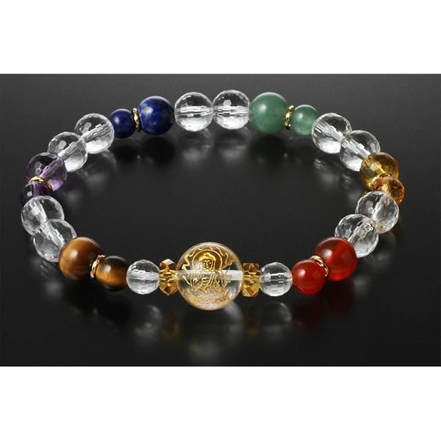 素材:白水晶:12mm珠×1個(薬師如来刻印) 8mm珠(カット)×10個・6mm珠(カット)×2個 黄水晶:8mm珠(カット)×1個・6mm珠(カット)×1個 6×3mm(カット)×2個 アメジスト:8mm珠(カット)×1個・6mm珠(カット)×1個 虎目石・赤メノウ・アベンツリン・ラピスラズリ:8mm珠×各1個 6mm珠×各1個