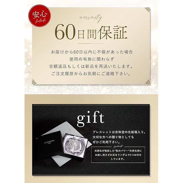 すべてのブレスレットを京珠堂刻印入り専用化粧箱に入れた状態でいたしますので、そのままプレゼントとしてご利用頂けます。浄化用さざれ石:天然石が吸収したマイナスエネルギーを元の状態に戻すときにお使い下さい。「京珠堂」ブランドはメーカーである弊社株式会社ヴィクトワールが所有する自社ブランドで、商標登録済みです。(登録第5821605号)ご購入の際は販売元が「天然石卸売りの京珠堂」であることをご確認の上ご購入ください。
