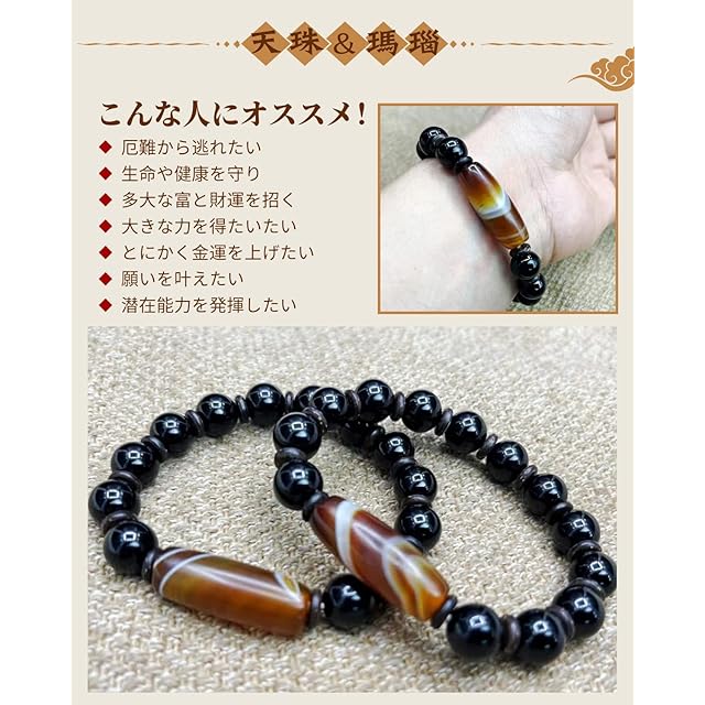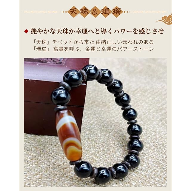 艶やかな天珠が 幸運へと導くパワーを感じさせます。チベットから来た由緒正しい云われのある天珠瑪瑙とオニキスを組み合わせたお金に関する全ての運を向上させるお守りブレスレット。「瑪瑙」 富貴を呼ぶ、金運と幸運のパワーストーン。