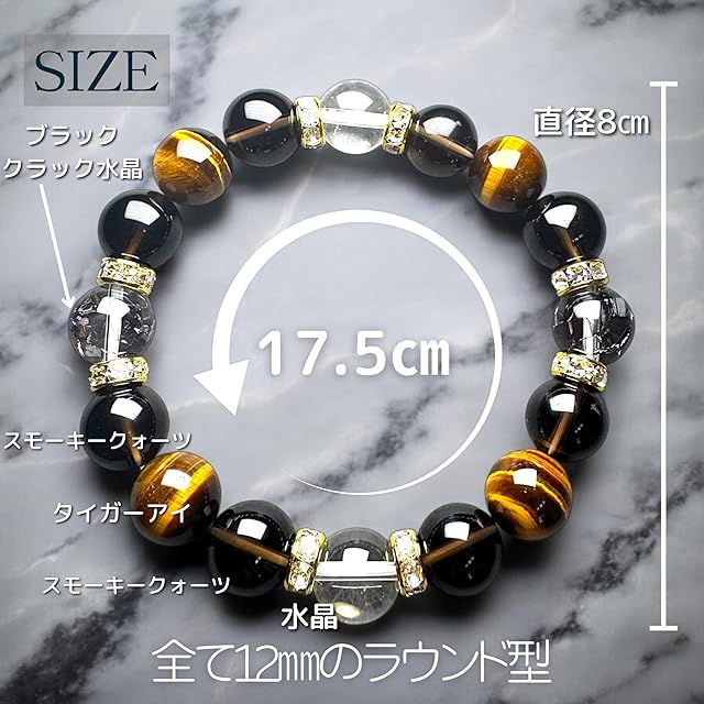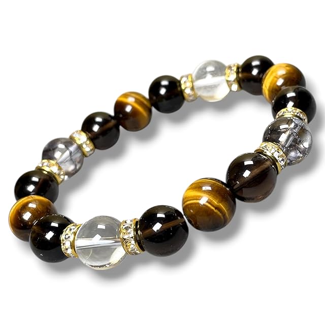 《size》<br>・タイガーアイ12ミリ<br>・ブラッククラック水晶12ミリ<br>・水晶12ミリ<br>・スモーキークォーツ12ミリ<br>・ 内周17.5~18cm<br><br>《stoneの説明》<br>【タイガーアイ 】<br>金運や仕事運を高め、願望の達成をサポート<br>してくれる石として高い人気を誇るタイガーアイ。<br>光の反射によって縞模様が虎の眼のように見える<br>ことから、古くより虎の眼のごとく<br>『すべてを見通す眼』と考えられてきました。<br>その『眼』のパワーは洞察力を高め、<br>物事の本質を見抜き、災厄を退け、成功をもたらす<br>といわれています。<br>【ブラッククラック水晶】<br>>クラック水晶は、万能と云われる水晶より強い浄化作用があるとされています。 <br>直観力を研ぎ澄まし、夢を実現させるサポートをしてくれるでしょう。<br> 疲労回復効果も期待出来そうです 。 <br>【水晶】<br>水晶のパワーは、調和・統合・強化。 そして非常に優れた浄化作用をもたらす石として知られています。<br>石はもちろん、すべてのものに対しての調和を生み出し、それらをうまく統合させ、より強力なパワーを発揮させるように導いてくれるます。<br>目標や前に進むべき道をより明確にし、夢の実現をサポートしてくれるといわれています。<br>また心身の活性化や潜在能力の開花、直観力や想像力の強化などにも力を貸してくれます。<br>まさに、パワーストーンのなかでも特に、万能的な存在です <br>【スモーキークォーツ】<br>心身を安定させ、持ち主の精神を安定した方向へ導き、恐怖や不安を解消するのに<br>役立ちます。他人の悪想念や、霊的、環境的マイナスエネルギーから持ち主を守る<br>石で、邪気払いのお守りとしてもオススメ です。 <br><br>※石の効果・効能などはそれをするものではございませんのでご了承ください。