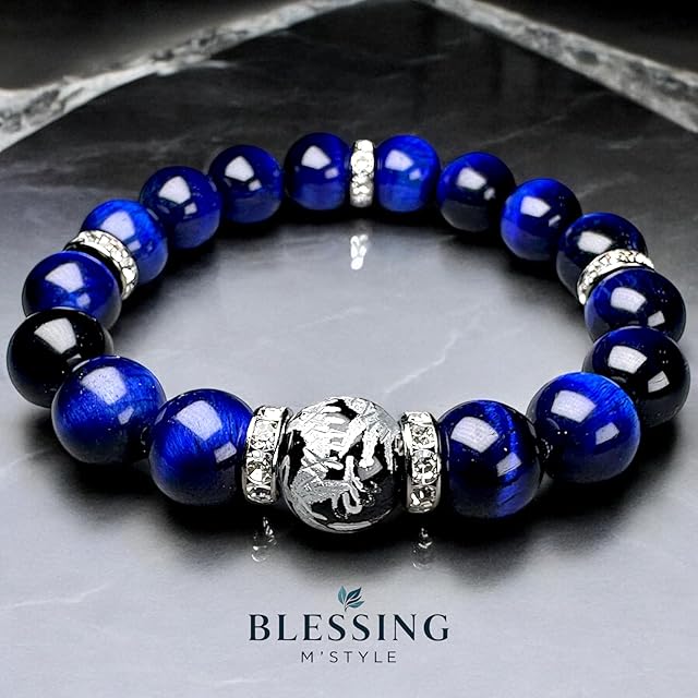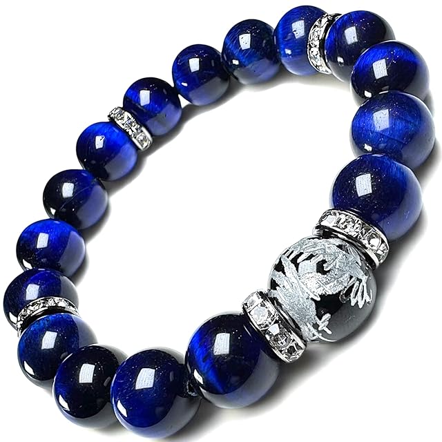 [BLESSING M'style] 天然石 パワーストーン ブレスレット メンズ 決断前進の石 ブルータイガーアイ ラピスカラー 五爪皇帝龍銀彫り オニキス パワーストーン ブレスレッド ロゴ入り スエード調高級巾着袋付き