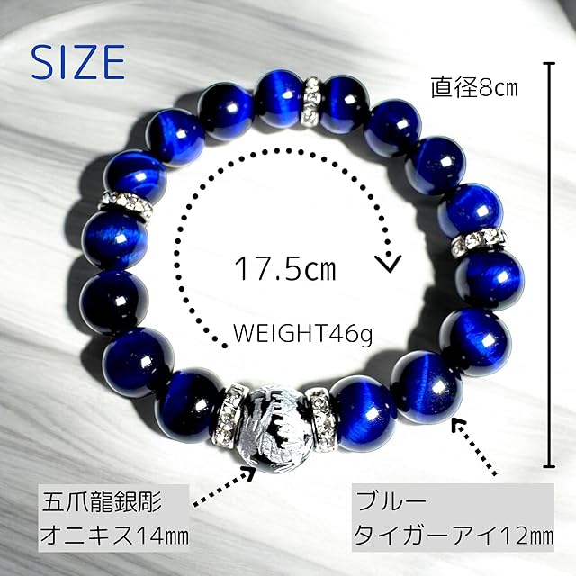 《size》<br>・皇帝龍銀彫りオニキス14mm<br>・ブルータイガーアイ(ラピスカラー)12mm<br>・ブラッククリアロンデル10mm<br>・ 内周約17.5~18cm<br><br>《stoneの説明》<br>【ブルータイガーアイ 】<br>決断の石、前進の石。ブルータイガーアイはタイガーアイの意味と効果と同じく金運、健康運を高める効果があります。<br>素早い判断と決断、先を見通す力を持ち主にもたらします。人の上に立つポジションの方には強力なサポートとなります。<br> また、古代より強力な魔除けの石とされ、悪運に強くなる効果が期待できます <br> 【 五爪皇帝龍銀彫りオニキス】<br> 五本爪の龍は権力のシンボルとして皇帝のみが所有をした最強の龍です。<br>全ての龍の中でも特に強力なエネルギーを持っており、「地位・名誉・権力・財運・繁栄」を五本の爪で掴み取るとされています。<br><br>※石の効果・効能などはそれをするものではございませんのでご了承ください。