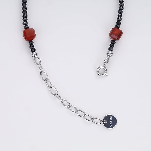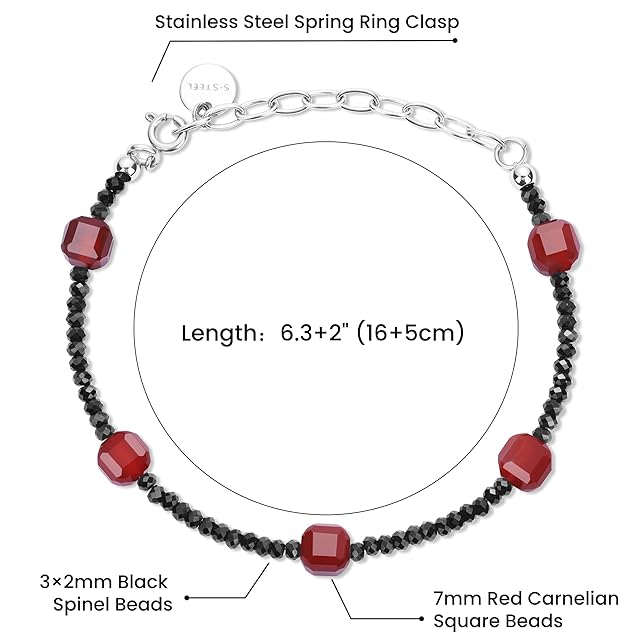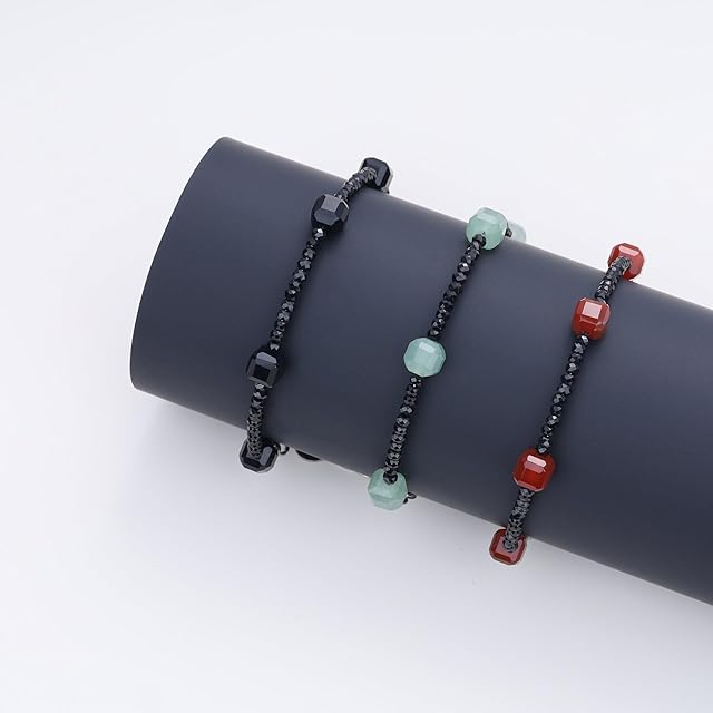手元にさりげない彩りを添える、パワーストーンとスピネルビーズのコンビネーションブレスレットです。7mmサイズのスクエアカットストーンに、きらめく3×2mmのスピネルビーズを組み合わせた細身のデザインは、シンプルながらも個性を感じさせます。<br><br>3種類の組み合わせからお選びいただけます。<br>カーネリアンは活力を感じさせるような温かみのある色合いが特徴で、気分を前向きに整えたいときにぴったり。<br>オニキスは落ち着いた印象を与える深い黒が魅力で、身につける人の雰囲気を引き締めてくれます。<br>グリーンアベンチュリンはやわらかな緑色が印象的で、日々の装いに自然な彩りをプラスしてくれます。<br>ビーズブレスレットの留め具には、丈夫で扱いやすいステンレス製のヒキワを使用、全長は約16cmに5cmのアジャスターが付き、幅広いサイズに対応します。<br>お届けは、そのまま贈り物としても使えるジュエリーボックス入り。自分へのご褒美にはもちろん、大切な方への贈り物としてもおすすめです。<br>季節や装いを問わず活躍してくれる、軽やかで上品なレディースブレスレットです。