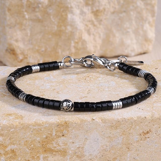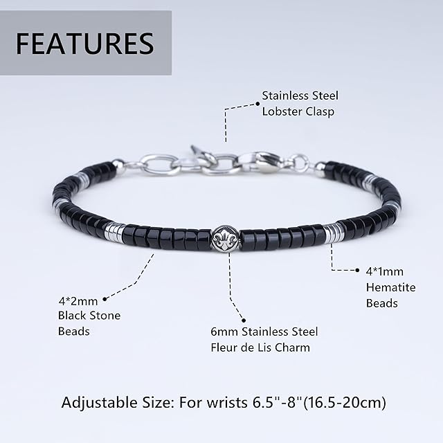 ブラックストーンブレスレットの中央には、象徴的なフルール・ド・リス(ユリの紋章)を模した6mmステンレスビーズを配置。フルール・ド・リスは古くから高貴さや誠実さ、信念を表す紋章として親しまれております