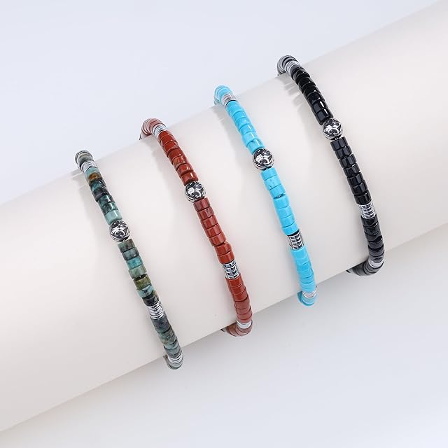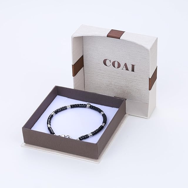 COAIのメンズパワーストーンブレスレットは、スタイリッシュな印象を持つ細身のビーズブレスレットです。4×2mmサイズのパワーストーンビーズに、4×1mmのヘマタイトビーズを組み合わせ、すっきりとしたシルエットに仕上げました。<br>中央には、シンボリックなモチーフである6mmサイズのステンレス製フルール・ド・リスビーズが配置され、全体の印象を引き締めています。<br><br>フルール・ド・リス(ユリの紋章)は古くから高貴さや忠誠、精神性を象徴する紋章として知られています。控えめながら存在感のあるそのデザインが、ブレスレット全体に意味のあるアクセントを与えています。<br><br>パワーストーンは、ブラックストーン、アフリカンターコイズ、ターコイズ(人工石)、レッドジャスパーの4種類からお選びいただけます。それぞれの石には異なる雰囲気があります。<br>ブラックストーンは静かで引き締まった印象を持ち、アフリカンターコイズは個性的で模様の変化が楽しめます。ターコイズ(人工石)は鮮やかな色合いが魅力で、レッドジャスパーは落ち着いた赤茶系の色が特徴です。<br><br>メンズブレスレットの長さは約19cm+3cmのアジャスターチェーン付きで、手首周り約16.5〜20cmの方にフィットします。<br>上品なジュエリーボックスに入れてお届けするため、ご自身用はもちろん、特別な日のプレゼントにもおすすめです。