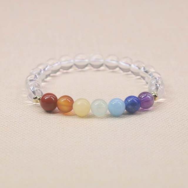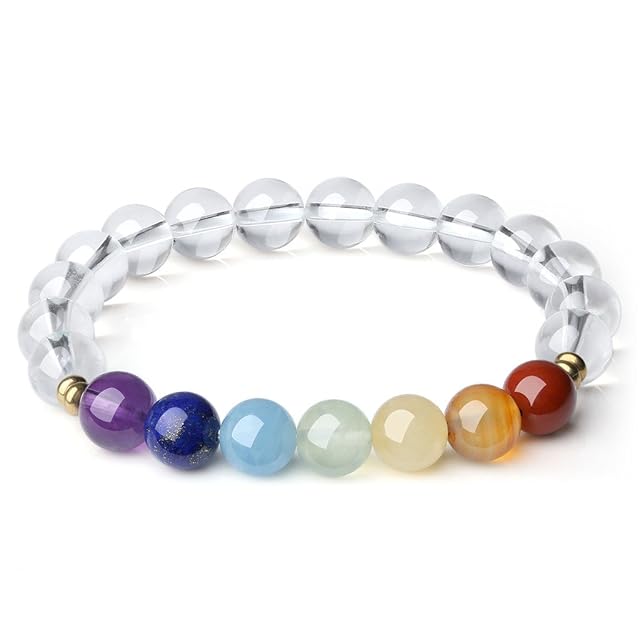 COAI商品は天然石を用い、自社のデザイナーがデザインし優れた技術のある職人が天然石を厳選して作り出したものでございます。<br>オシャレな外観があり、キラキラしています。<br><br><b>水晶</b><br>水晶は普段の生活にはもちろん、大切な祈祷や儀式など<br>神聖な場所でも用いられたと伝えられています。<br>完全に透明なクリスタルは、目標や前に進むべき道をより明確にし、夢の実現をサポートしてくれるといわれています。<br>また、水晶は心身の活性化や潜在能力の開花、直観力や想像力の強化などにも力を貸してくれます。<br>そして、その他の天然石のパワーを強めてくれる役割もあります。<br><br><b>チャクラ</b><br>ヨーガにおいての6輪プラス1輪というチャクラ説をモチーフし、七色のパワーストーンを使用しました。<br>七種類の色違い天然石を入れることによって、より個性的になります。<br>日々のファションアイテムやヨーガブレスレットや数珠としてご利用いただけると幸いです。<br>ヨーガをなさっている方は是非手に入れ、装着してみてください。<br><br>素敵なプレゼントボックス付きで、自分へのご褒美、家族、恋人、友達にプレゼントするのはオススメです。<br><br><br><b>注意事項</b><br>※玉のサイズに関しては、上質な天然石を加工した商品になりますので、多少のヒビ・欠けがある場合がございます。サイズ±0.5mmはご了承下さい。<br>※撮影機材の特性、またモニターの画面設定や環境により肉眼での色味と誤差が生じる場合がございます。<br>※商品の性質や構造上、配送時の摩擦等により止むなく小さい傷やくもり等が生じる場合がございます。予めご了承下さい。<br>※お届きの商品は大きな傷で使用できない場合、弊社は責任をもって再びお送りいたします。