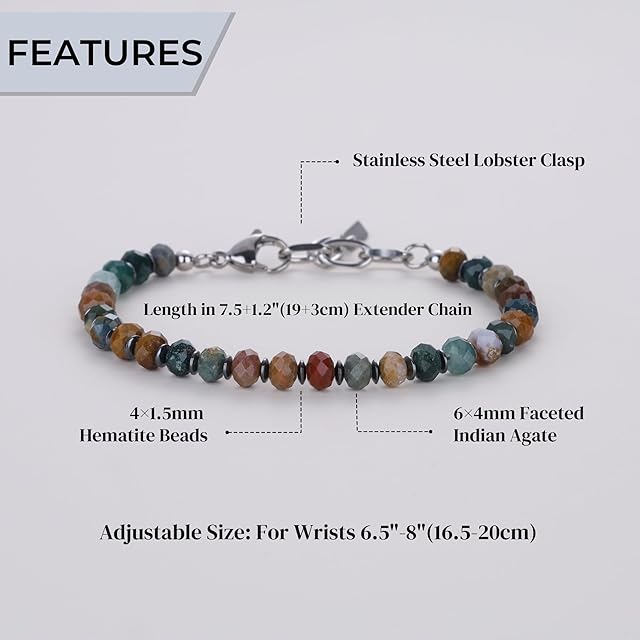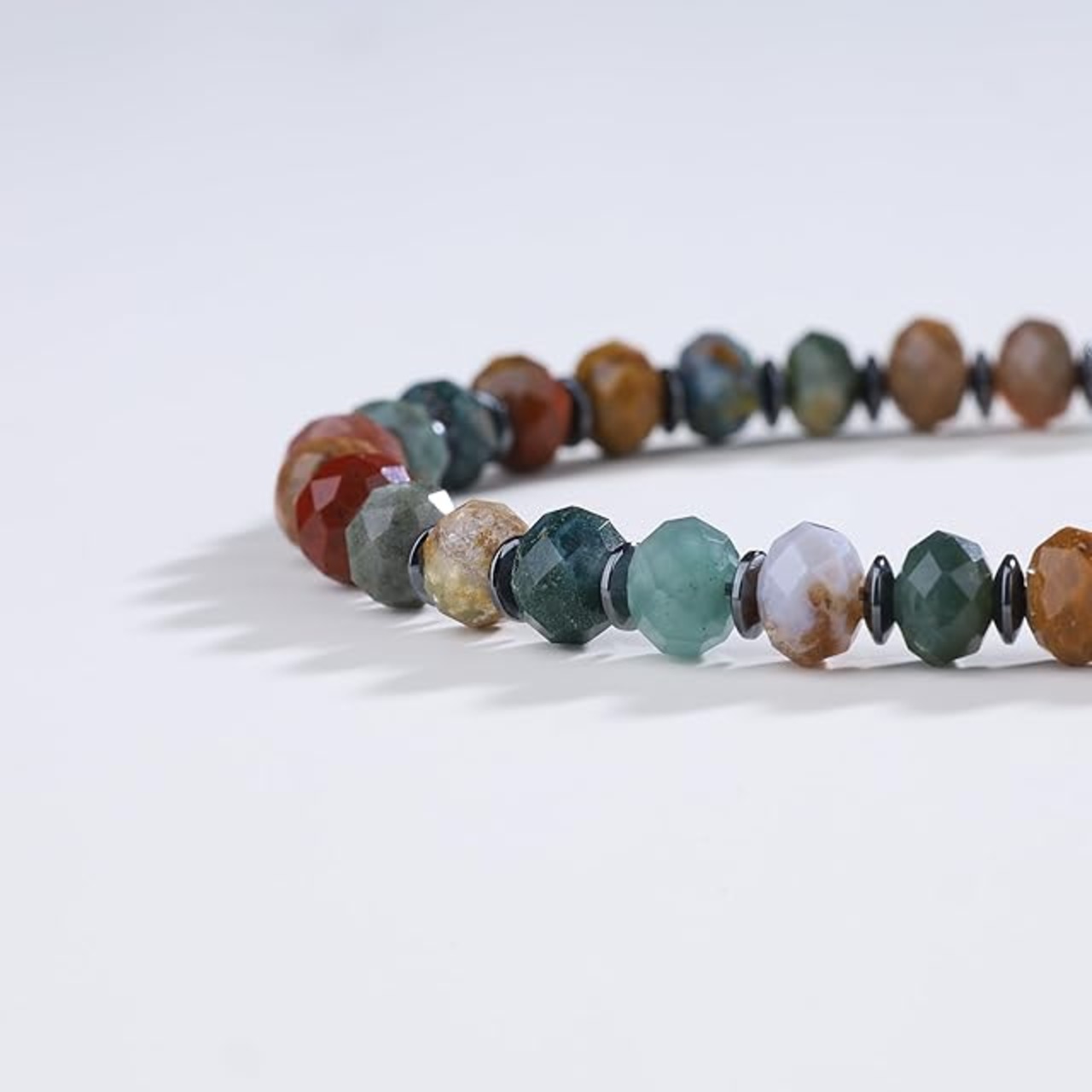 男性の手元に個性と存在感を添える、メンズパワーストーンブレスレットです。6×4mmのカットパワーストーンビーズと、4×1.5mmのヘマタイトビーズを交互に組み合わせることで、石の美しさとヘマタイトの光沢が互いを引き立てるデザインに仕上げました。<br>手元にほどよい重みを持たせながらも、日常使いに取り入れやすい一本です。選べる天然石は3種類。<br>鮮やかな青緑色が目を惹くアフリカンターコイズは、変化や挑戦に向かうエネルギーを象徴するとされ、新しいことに挑む方に人気です。<br>縞模様が特徴的なインドアゲートは、人との絆を大切にする石として知られ、信頼関係を築きたい方におすすめです。<br>海を思わせる色彩のオーシャンジャスパーは、大地や自然とのつながりを象徴する石とされ、持ち主に行動力や勇気をもたらすと伝えられています。<br>それぞれ異なる個性を持つ石を手元で楽しめるのも魅力です。<br>ビーズブレスレットの長さは約19cmに3cmのアジャスターチェーンが付き、腕回り16.5〜20cmに対応。調整可能な手作り仕様なので、快適にフィットします。<br>メンズブレスレットは上品なジュエリーボックスが付属するため、自分へのご褒美にはもちろん、誕生日や記念日など特別な日のプレゼントとしてもぴったりです。石の表情を感じながら身に着けるたびに、個性を手元に添える一本としてお楽しみいただけます。