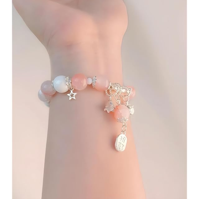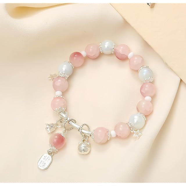 【デザイン】このブレスレットはピンクの瑠璃を主な色調としており、やわらかくつややかな色合いは春の夕焼けのように優しくて魅力的です。生き生きとして可愛らしい精巧なペンダントがいっぱい飾られており、どの細部にも元気いっぱいの活力があふれています。これはただファッションコーディネートを引き立てるいたずらっこなアクセントに過ぎないだけではなく、素敵な意味を担っており、幸運のお守りとして常に身のそばにそっと添い、身に着ける方に幸運のエネルギーを届けます。