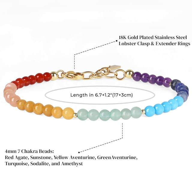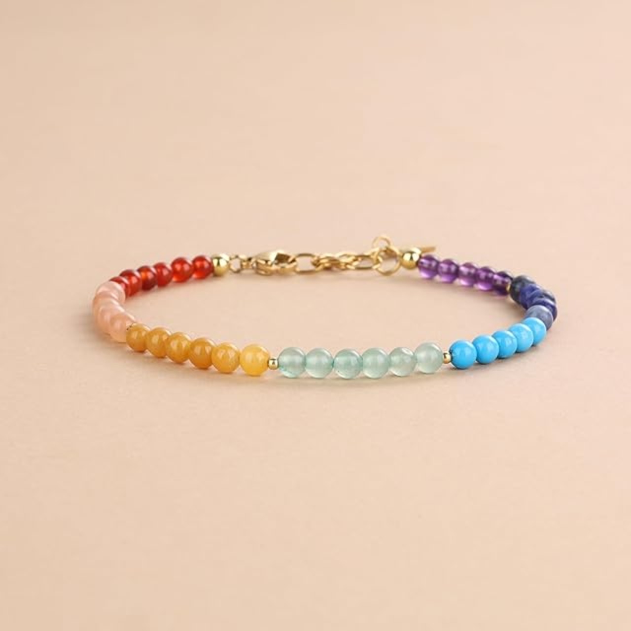 4mmのチャクラビーズ(レッドアゲート、サンストーン、イエローアベンチュリン、グリーンアベンチュリン、ターコイズ、ソーダライト、アメジスト)を組み合わせた美しいパワーストーンブレスレットです。自然の色合いが際立ち、日常使いにぴったりです