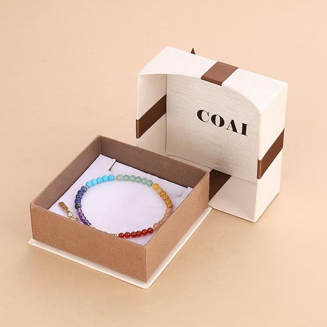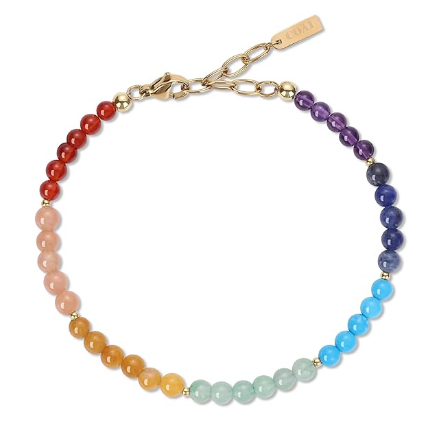 COAIのチャクラパワーストーンブレスレットは、2種類のパワーストーンの組み合わせからお選びいただけます。<br><br>1つ目は、4mmのチャクラビーズを使用し、レッドアゲート、サンストーン、イエローアベンチュリン、グリーンアベンチュリン、ターコイズ、ソーダライト、アメジストの7種類を組み合わせたレディースブレスレットです。<br>色とりどりのビーズが、手元を華やかに彩ります。<br><br>2つ目は、カットを施した3mmのチャクラビーズを使用し、ルビー、カーネリアン、シトリン、ペリドット、トパーズ、ラピスラズリ、アメジストの7種類を組み合わせたレディースブレスレットです。<br>洗練されたカットが、より一層魅力的な印象を与えます。<br><br>どちらのチャクラブレスレットも、長さ16cmに3cmのアジャスターチェーンがついており、サイズ調整が可能です。<br>素敵なジュエリーボックスに入れてお届けし、どんな服装にも合わせやすく、さまざまなシーンでご利用いただけます。