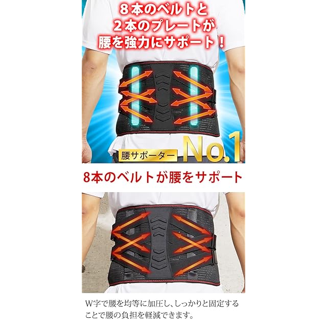 8本のベルトが腰をサポート W字で腰を均等に加圧し、しっかりと固定することで腰の負担を軽減できます。