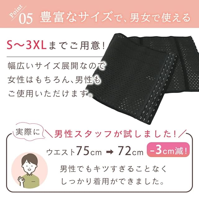 【男女兼用&豊富なサイズ展開】 S〜3XLまでの幅広いサイズを用意しており、女性はもちろん男性でもしっかり装着できるユニセックス仕様。実際にウエスト75cmの男性スタッフが着用し72cmまで引き締められた実績もあり、男性のボディライン補整や姿勢サポートにも活用可能。お腹まわりを引き締めたいけど市販品が合わなかった方にもおすすめで、夫婦や家族で共有も可能。毎日無理なく使える伸縮性と調整機能で、性別・年齢を問わず多くの人にフィット